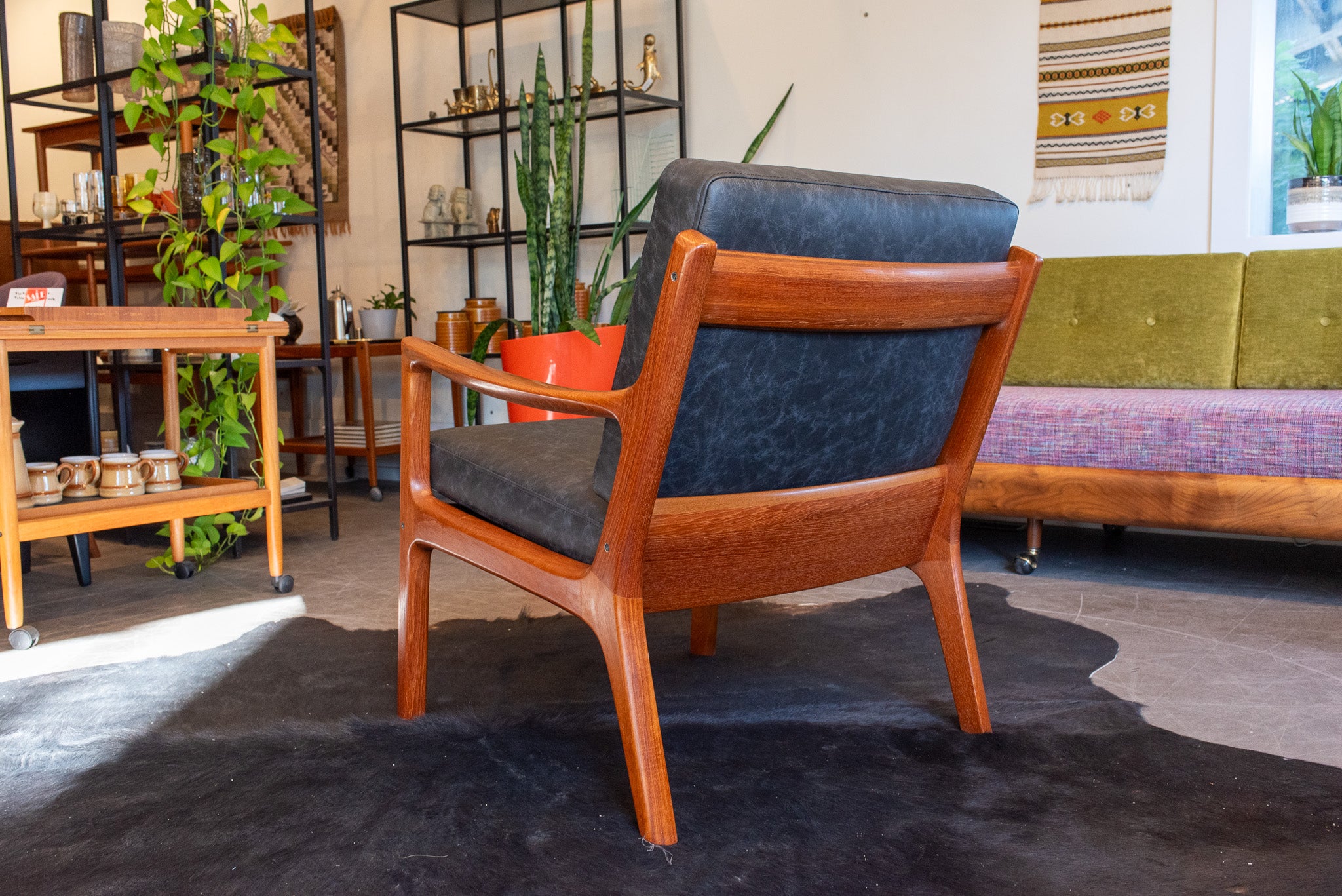 A classic restored teak frame by France and Son. New high-density foam covered in a mottled black leather.