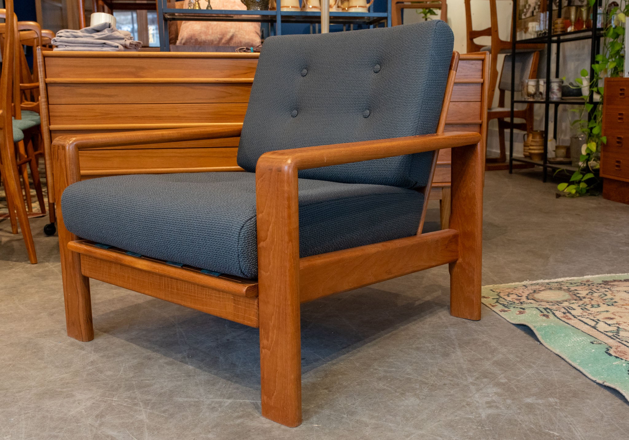 This solid teak lounge chair has had a complete overhaul. New webbing, foam, fabric and a refinished frame. All it needs now is a new home.