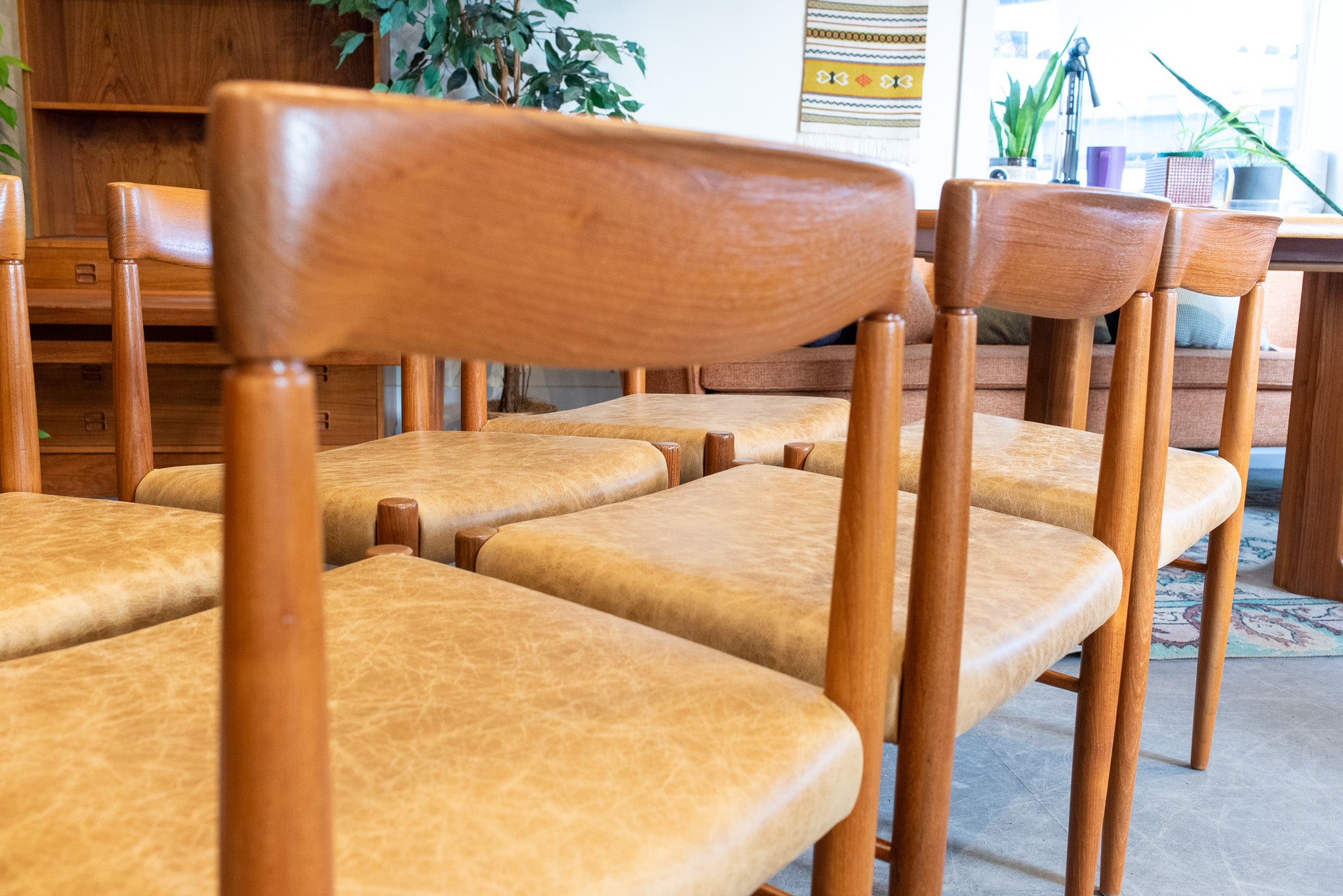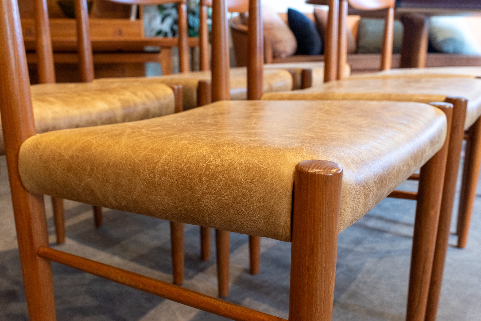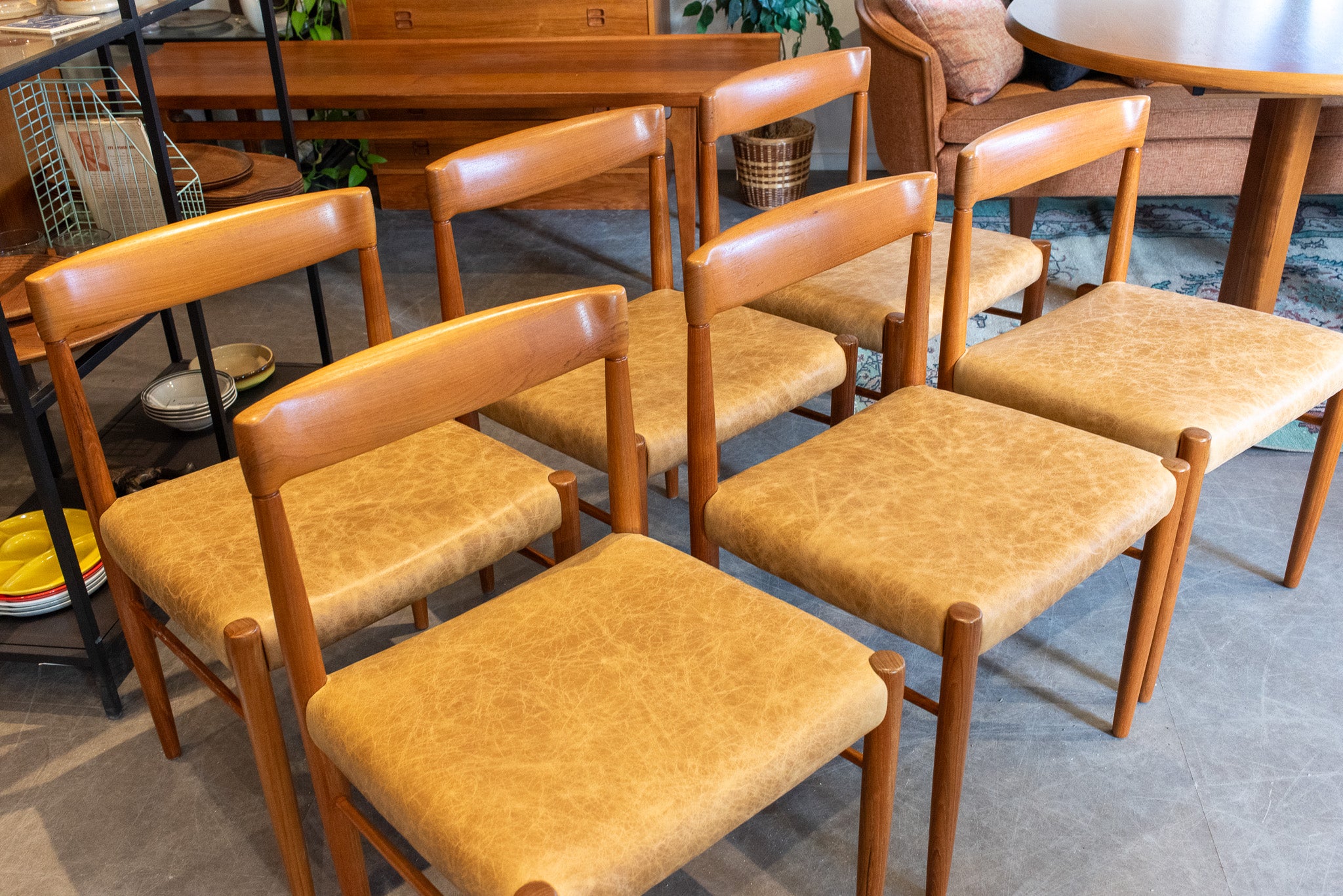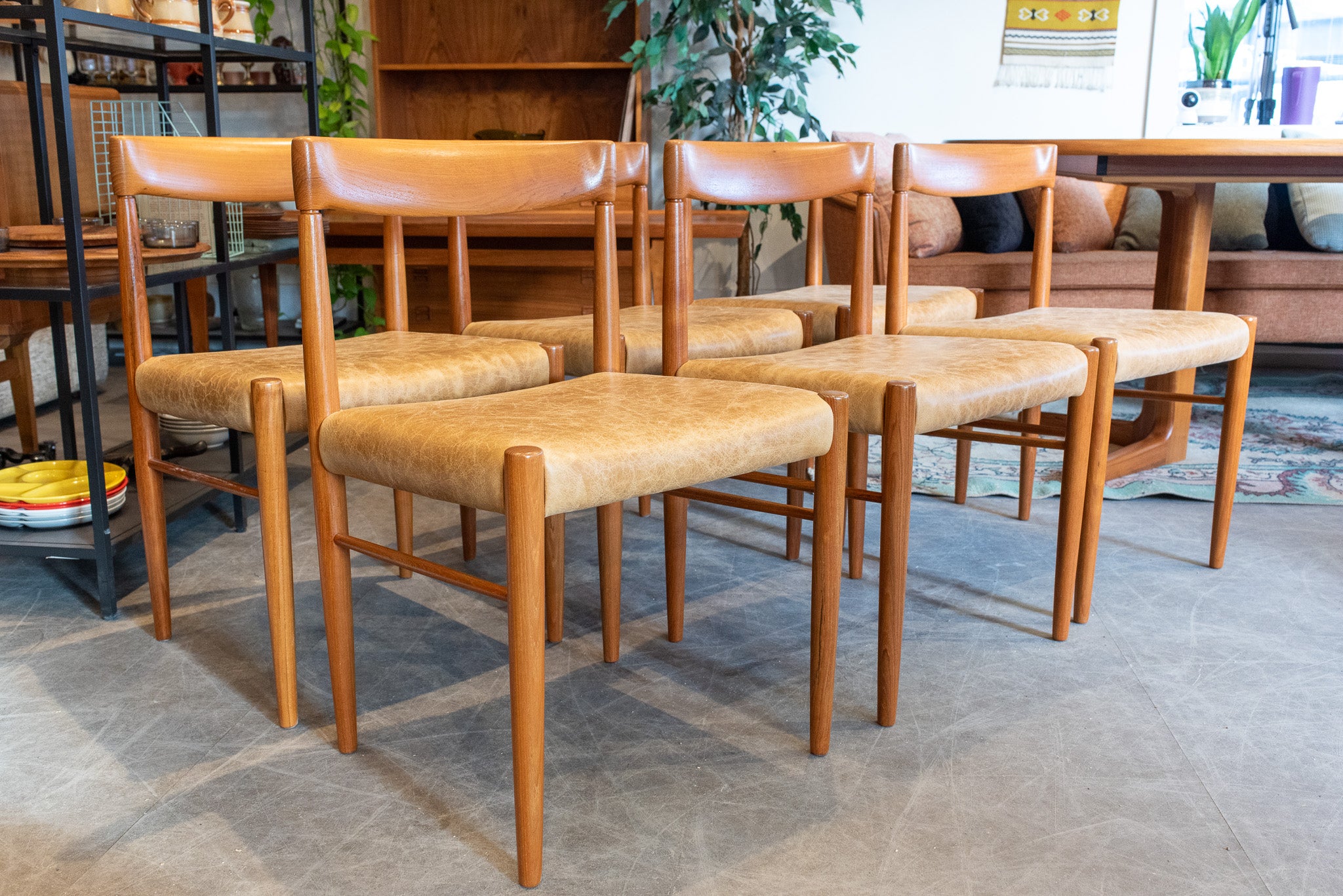 This set of six Bramin dining chairs have been fully restored. The sculptured teak frames pair beautifully with the tan leather seats for an elegant finish.