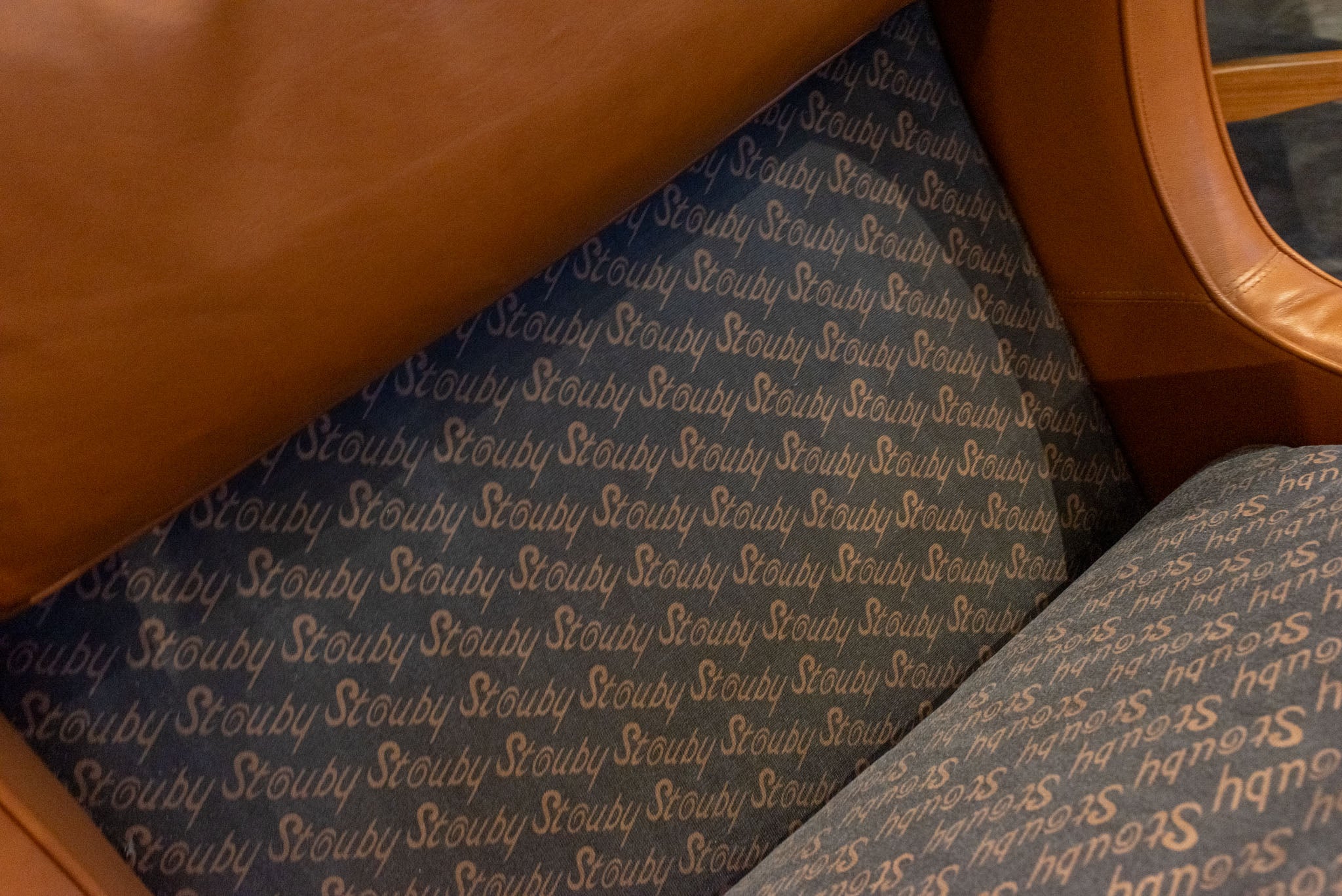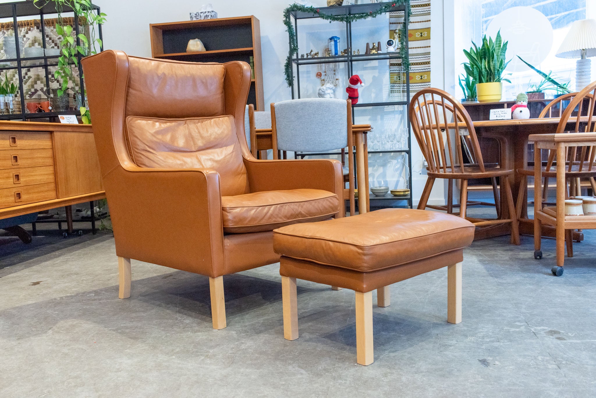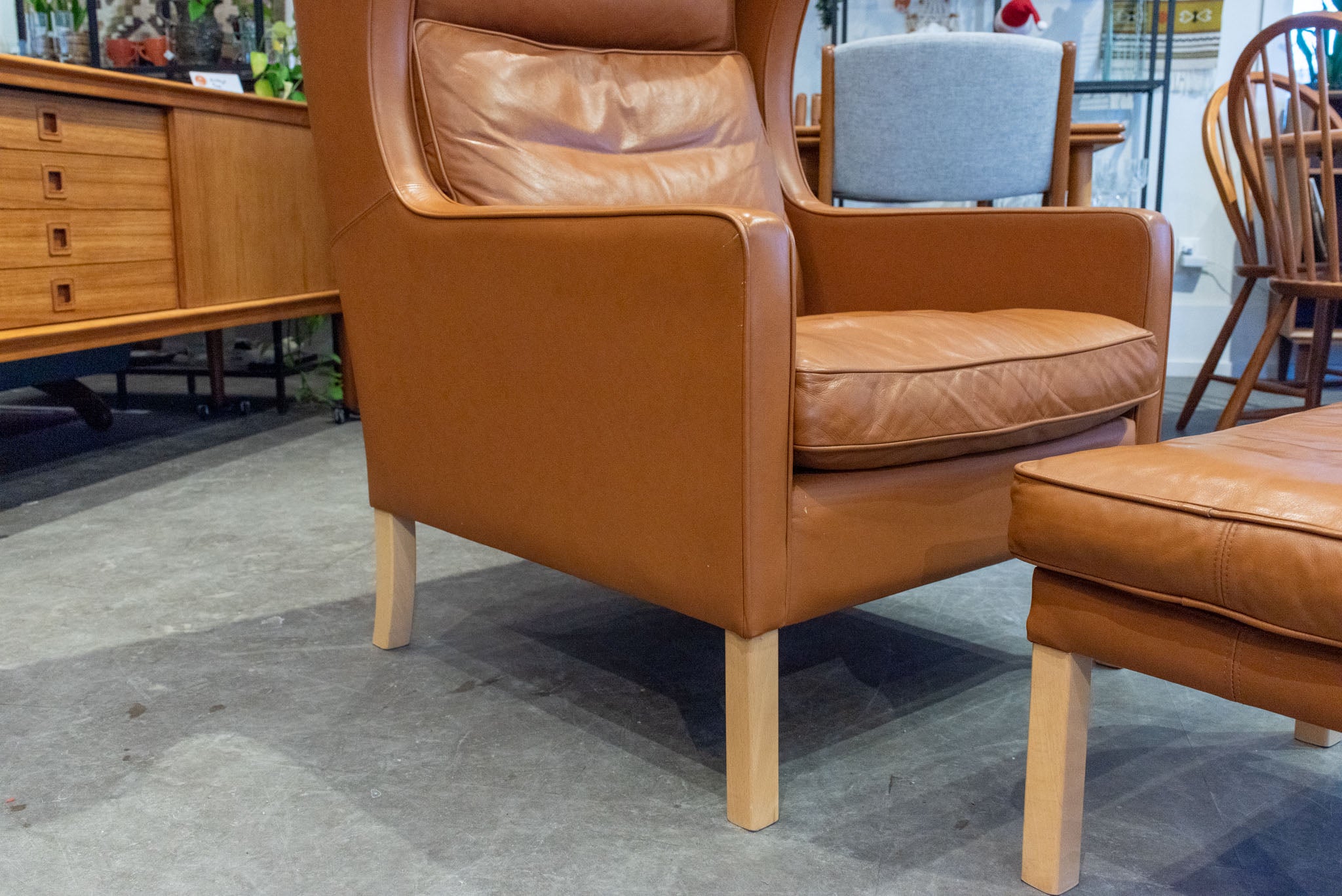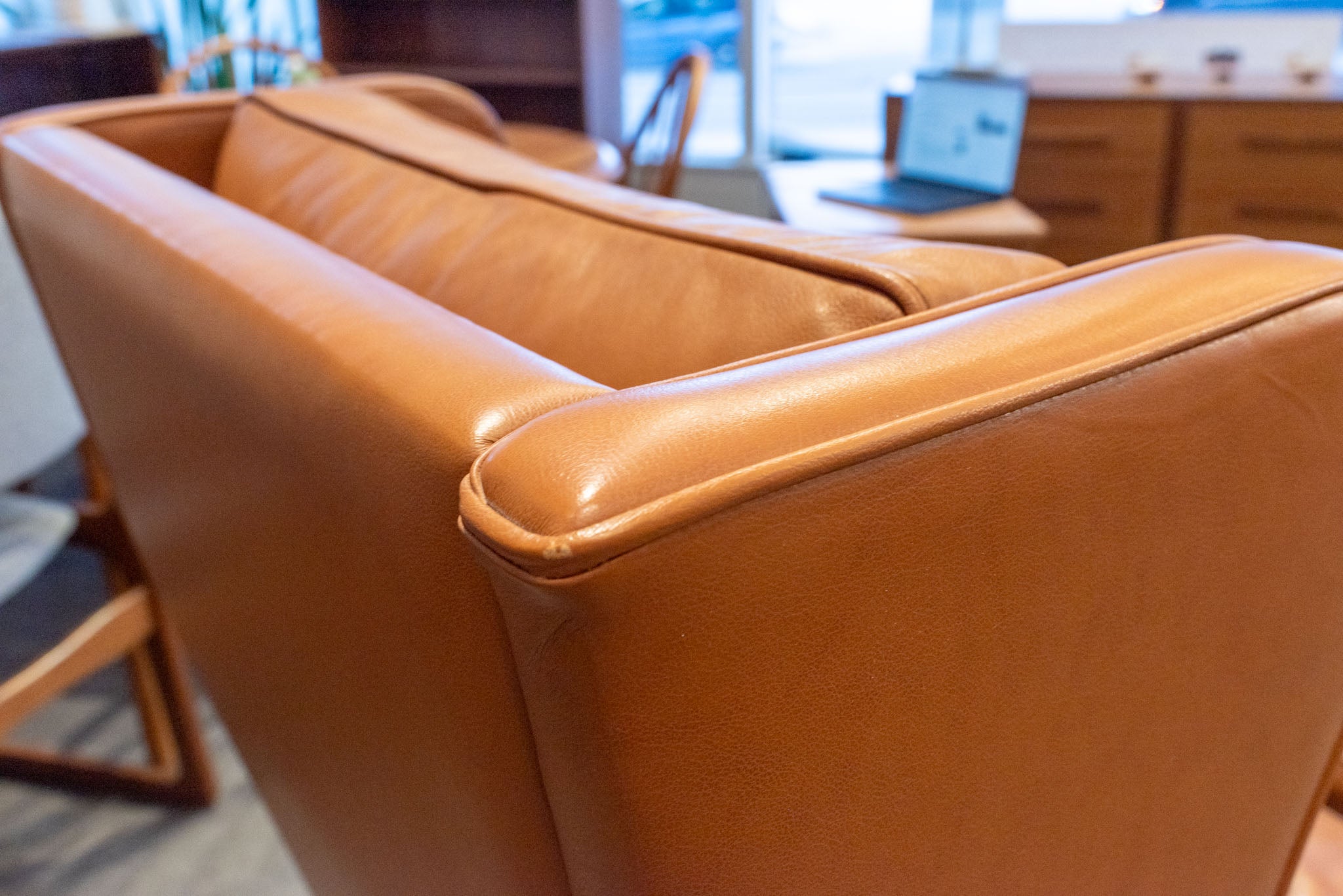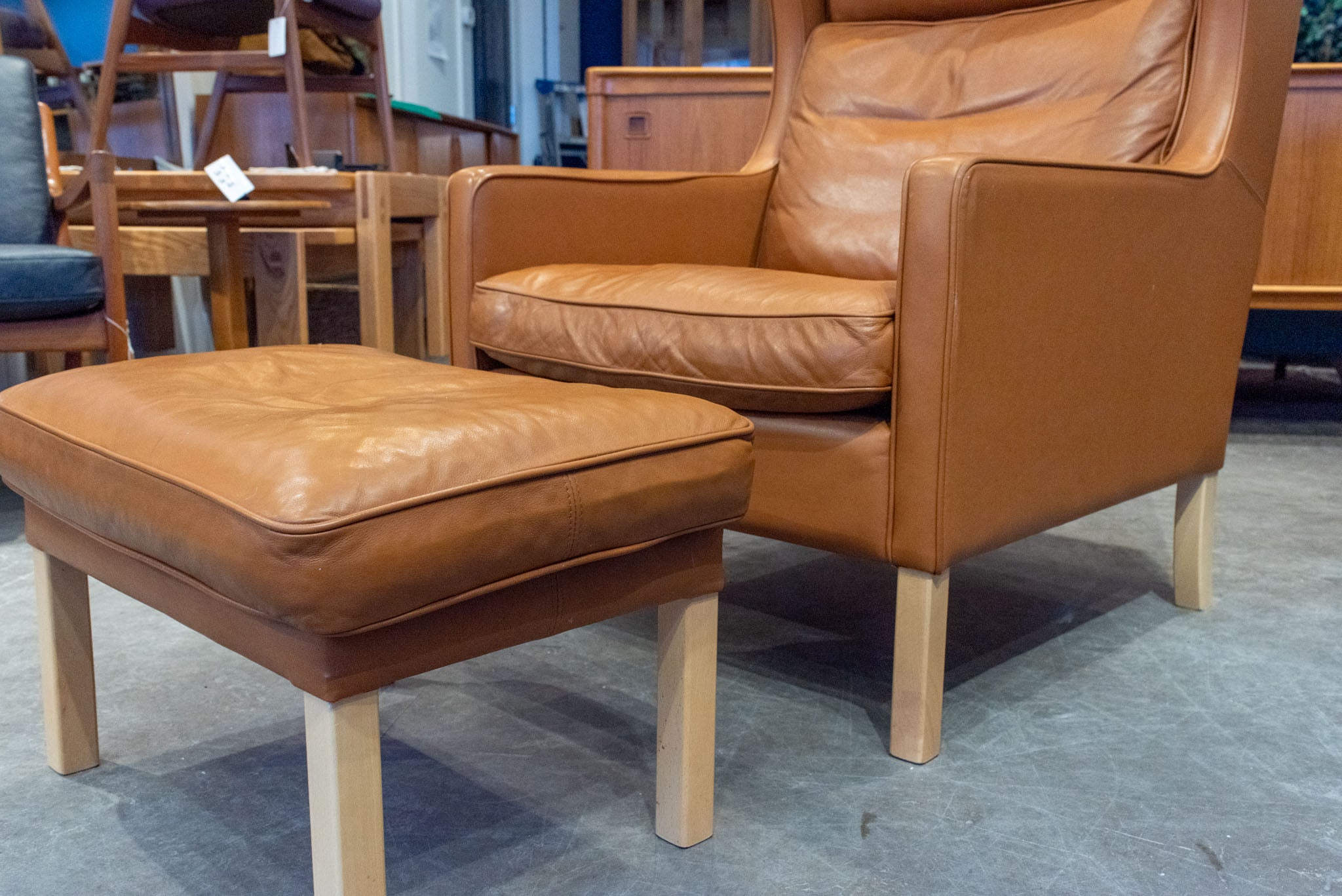 This leather lounger with an ottoman, by Stouby, is in very good vintage condition. No issues aside from a few minor leather scuffs, as appropriate for the age.