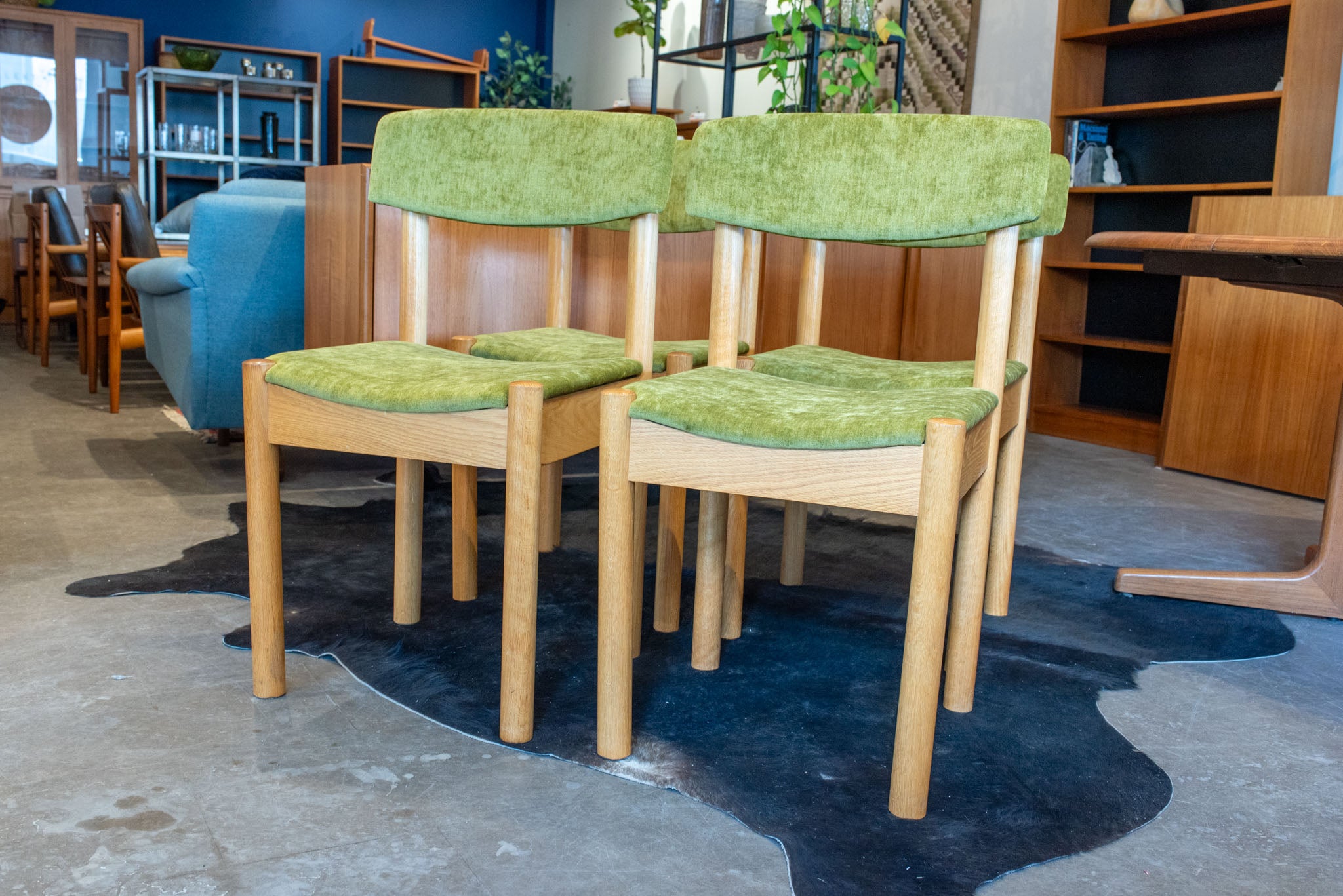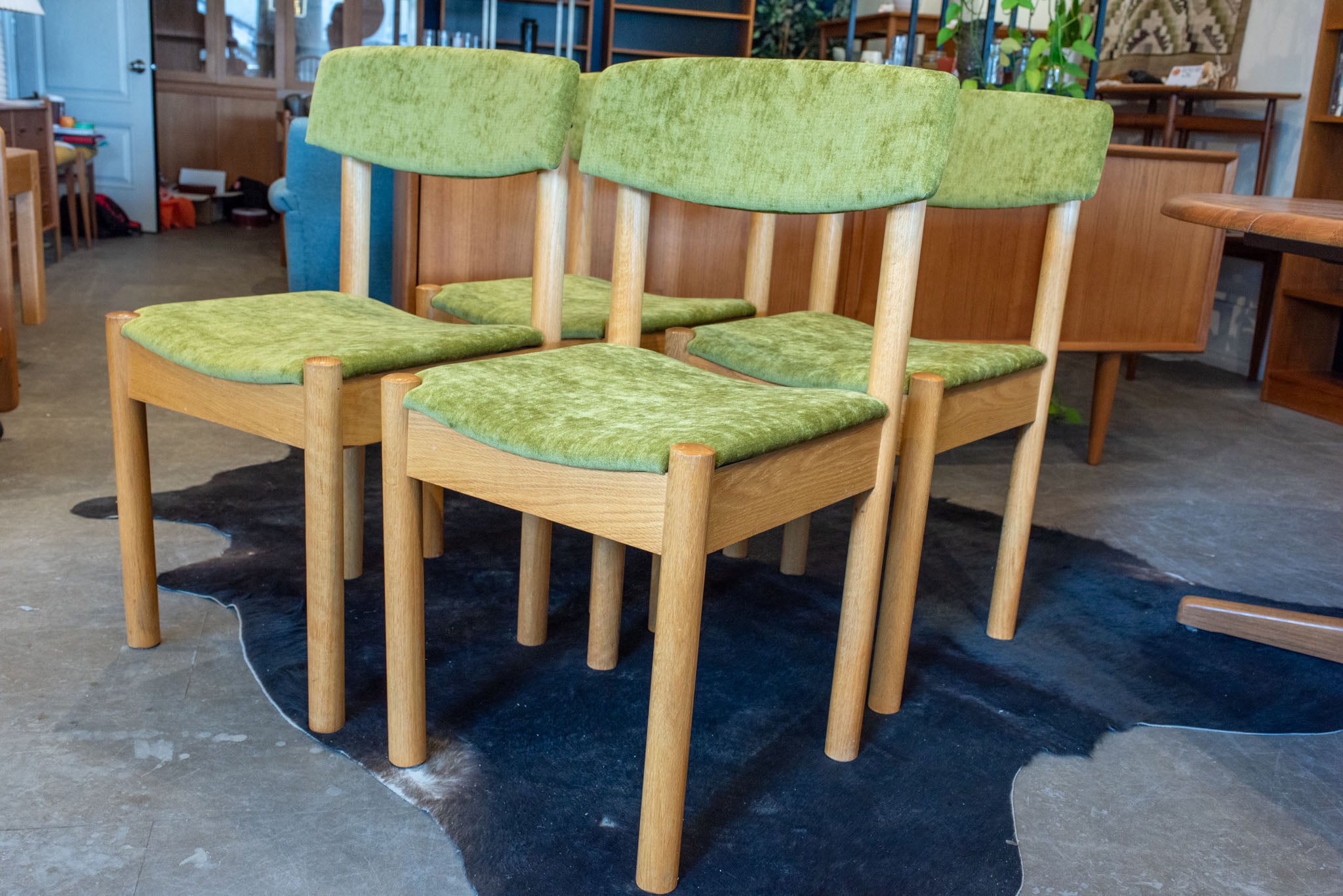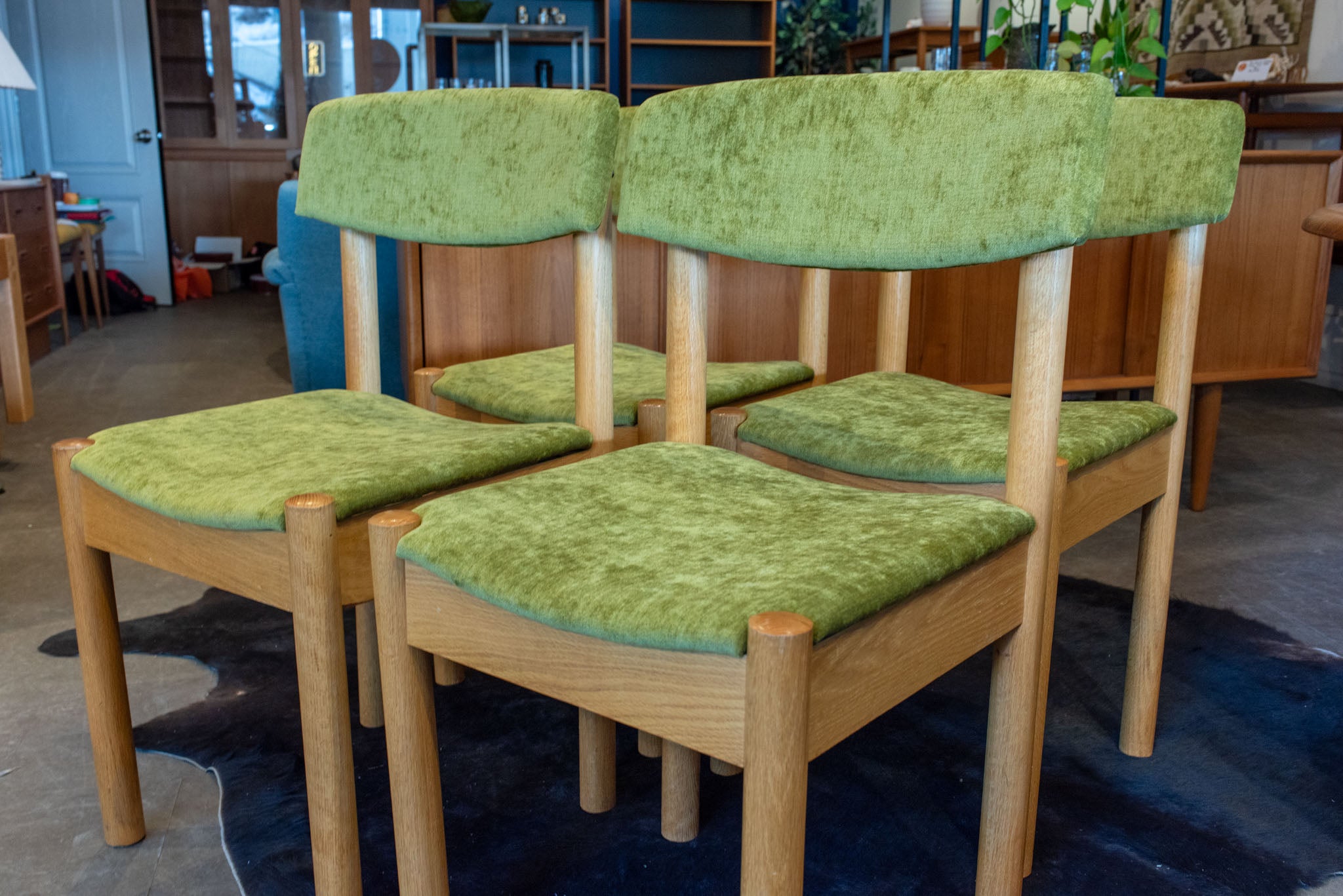 These steady oak dining chairs are in very good vintage condition. We've reupholstered them in a subtle green velvet and replaced the foam to give them that new chair feeling.
