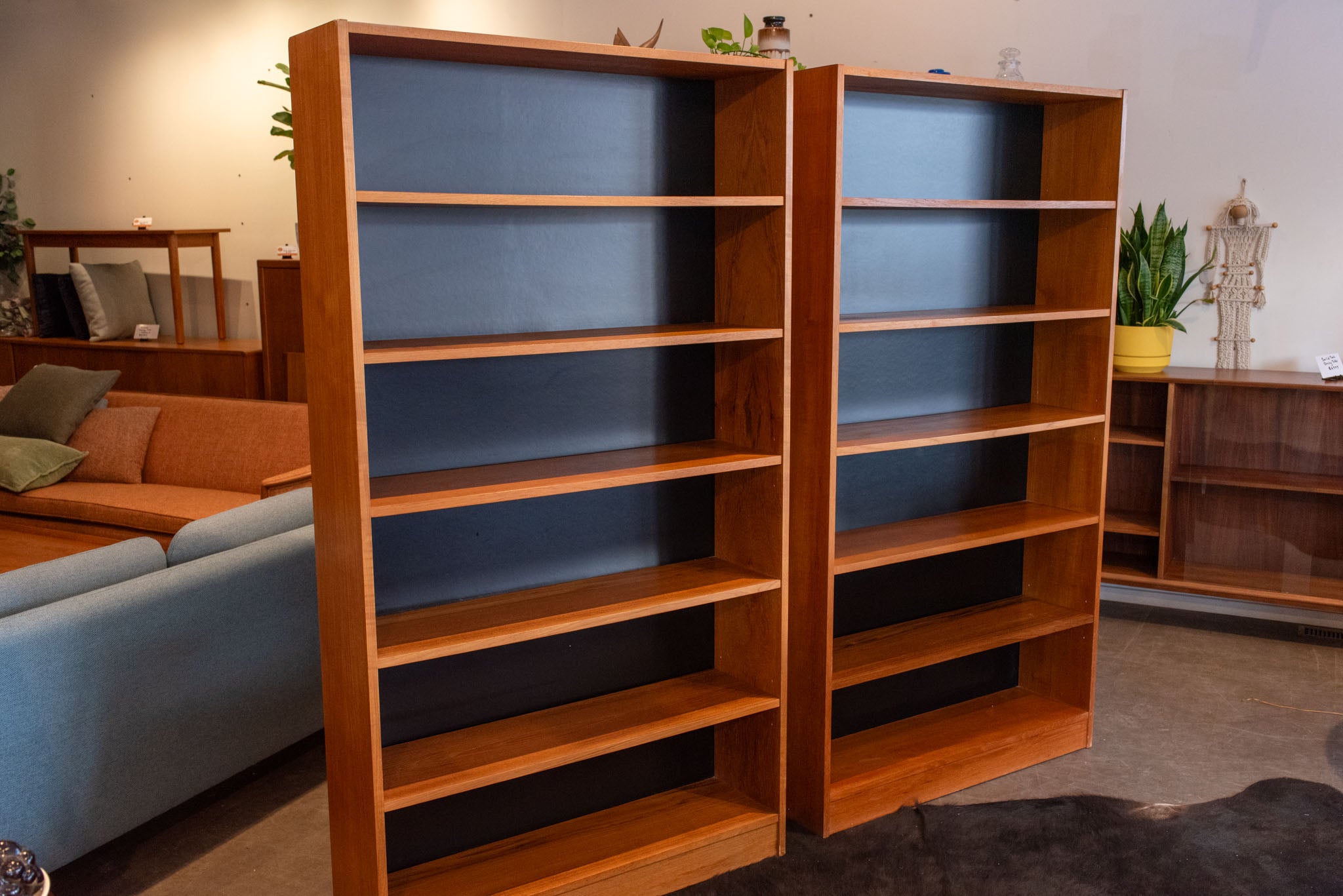 A Canadian made book case with adjustable teak shelves and a contrasting black background.